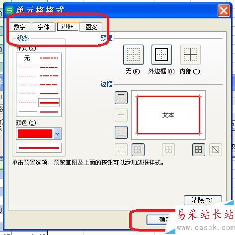 4、進入單元格格式設置,可以對數字,字體,邊框,圖案填充等選項根據實際需要做出調整,(這里將邊框設置為紅色線條),點擊確定。