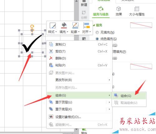 5、然后,將對勾和方框進行圖形組合。先選擇對勾,然后按住Shift鍵,選擇方框,然后在圖形上點擊鼠標右鍵,選擇組合。