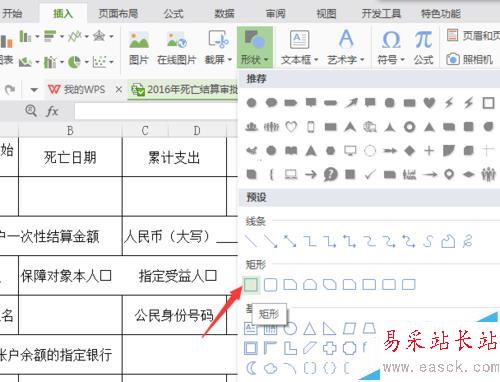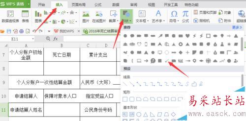 1、在你需要輸入表格內找到“插入”,選擇“形狀“,找到“√”