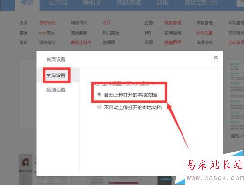3、也可以將鼠標移到頭像右上角的九宮格圖案,出現小菜單后,點擊設置,點擊全局設置(原文檔漫游,找了好久原來跑這里了),點擊自動上傳打開的本地文檔。就設置成功了,快去試一試吧。