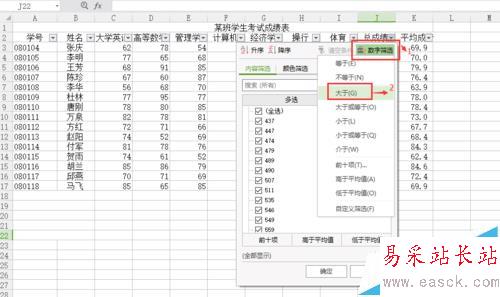 4、點擊數字篩選,然后選擇大于,輸入500分。即可篩選出總分大于500的同學。