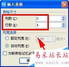 4、在跳出的“插入表格”對話框中,將“列數”設置為2,“行數”設置為4,并點擊確定。