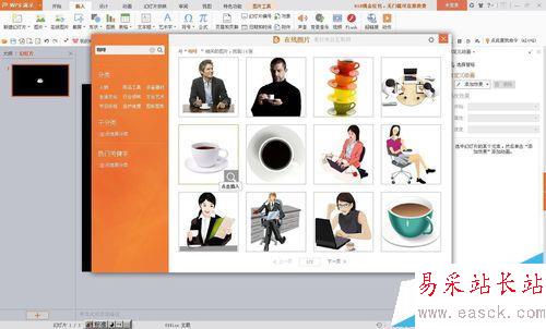 1、將背景設置成黑色,插入在線圖片,搜索咖啡,找到咖啡杯。