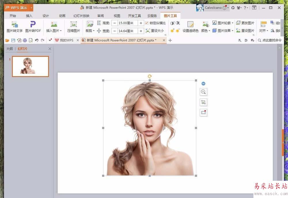 1、首先選一張圖片添加在PPT里,我這里用的是WPS。自己設置好圖片的大小。