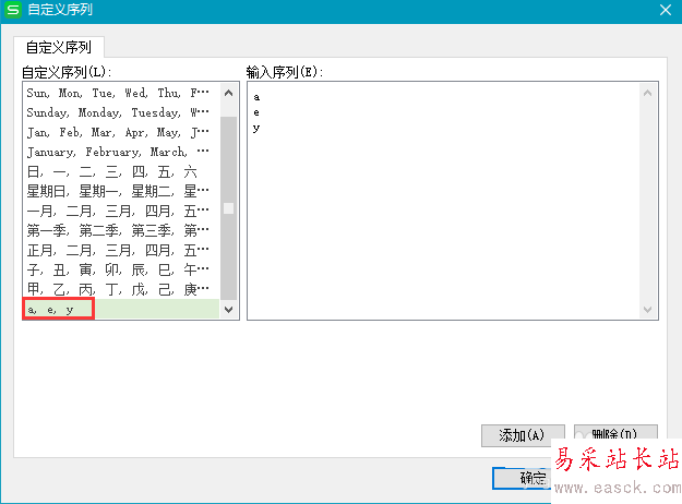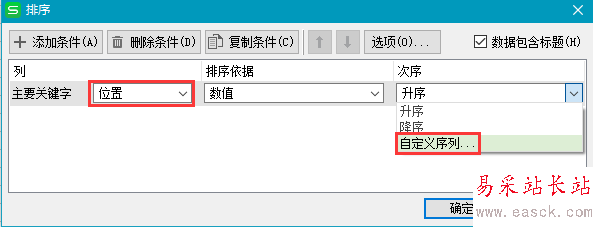 5、在彈出的“排序”對話框中,選擇自定義序列,在彈出的“自定義序列”對話框中,選擇剛才導入的自定義序列