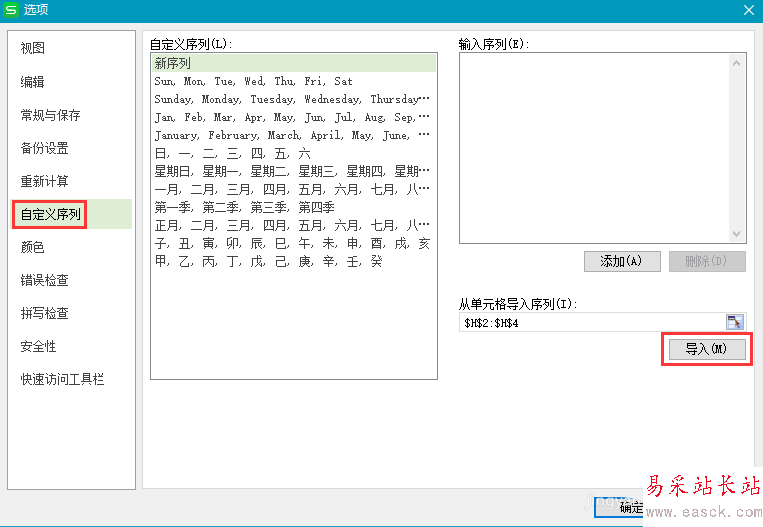 3、在彈出的“選項”對話框中,選擇“自定義序列”,點擊“導入”,再“確定”