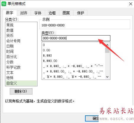 4、在右邊的“類型框”中輸入“000-0000-0000”即可