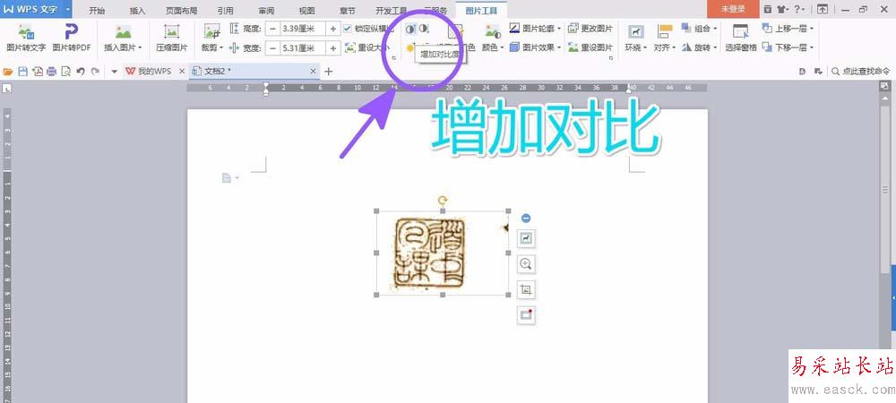 5、在編輯區,找到圖片工具,先用透明色將圖片本身的顏色去掉,我們發現去掉顏色的印章污點很多,這就需要我們用到增加對比工具欄,對比工具可以將圖片亮面變得更亮暗面變得更黑,中間色變少,即所謂的污點變少。