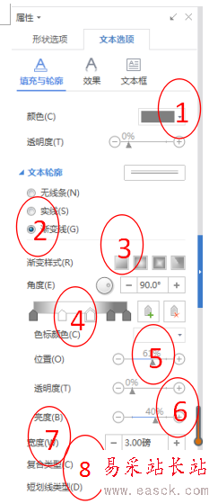 6、美化處理。繼續在文本選項中,選擇“填充與輪廓”,單擊文本填充“純色填充”,選為“深灰色”。文本輪廓選為“漸變線”;選擇“漸變式樣”;改變角度,移動標尺,移到我們需要的位置。色標顏色,選為“白色”;選擇“透明度”、“亮度”;選擇色標的“寬度”;選擇“復合類型”和“短劃線類型”