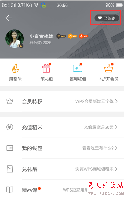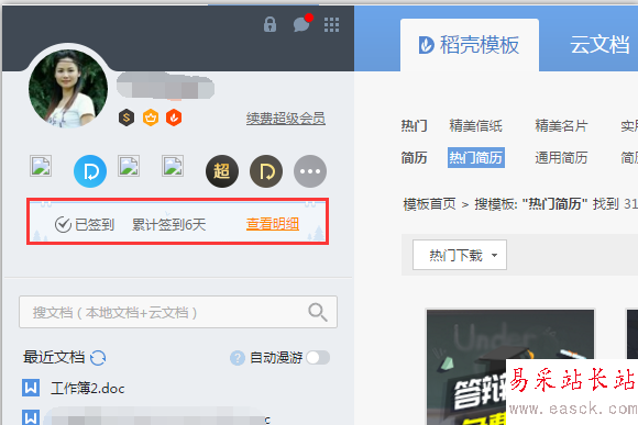 1、WPS的 PPT word 表格 都有模板,有些是付費(fèi)的嗎,有些是免費(fèi)的,付費(fèi)的需要稻米,這里小編告訴大伙只需每天簽到就可以賺取稻米去買那些付費(fèi)的模板,電腦端簽到 往右邊看 可以看到【錢包】可以看到每天簽到所賺取的稻米 如圖提示