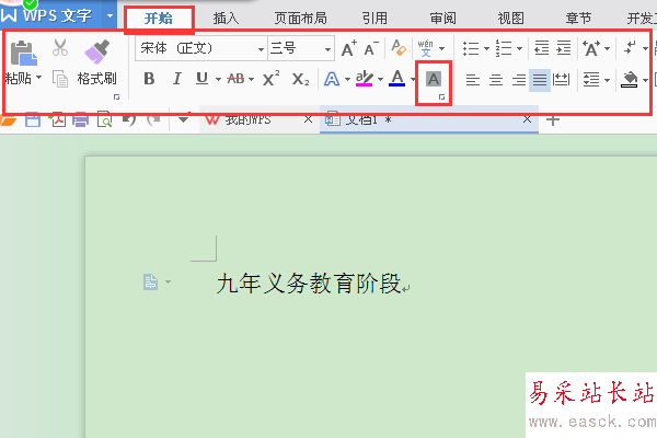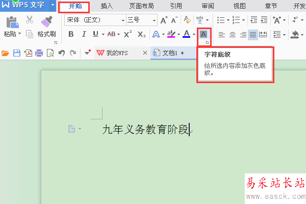 2、我們現(xiàn)在想要給文檔內(nèi)容添加“字符底紋”,我們在WPS文字的頁面菜單“開始”菜單中找到下圖標(biāo)出的選項 ,如下圖所示