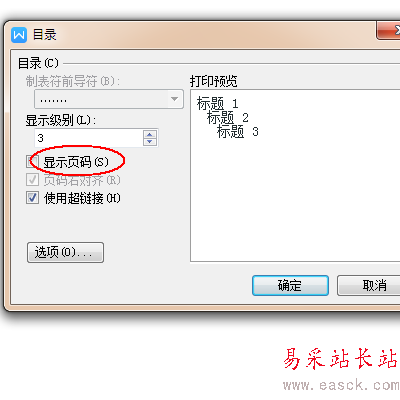 7、點擊“插入目錄”,在“目錄”窗口下將“顯示頁碼”前的對勾去掉。