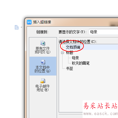 在“插入超鏈接”窗口下點擊“本文檔中的位置”-“文檔頂端”,確定即可。