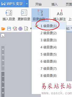 4、點擊“目錄級別”的倒三角-選擇“1級目錄”。其他目錄標題如法炮制。