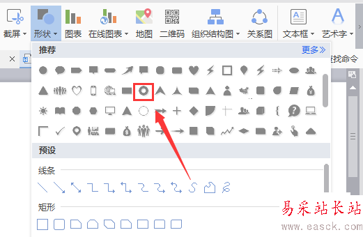 4、點擊形狀選項,在其子級菜單里找到推薦選項,如圖所示: