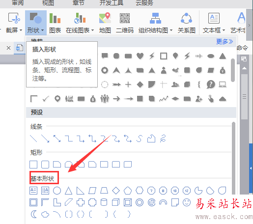 4、點(diǎn)擊形狀選項(xiàng),在其子級菜單里找到基本形狀選項(xiàng),如圖所示: