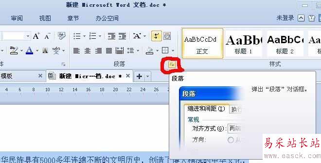 4、調出修改行距的工具。點擊段落右下角的下拉符號,下圖中我用紅色的筆圈了一下。單擊下拉符號,會彈出“段落對話框”。