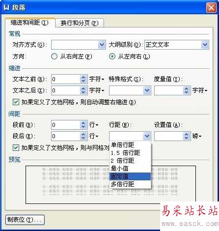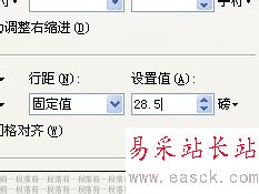 5、修改行距。點擊行距下面的下拉符號,使其彈出下拉菜單,點擊“固定值”。然后選中旁邊的設置值下的“12”,在鍵盤上敲入你想要的行距,筆者修改為28.5磅。然后點擊下面的確定。