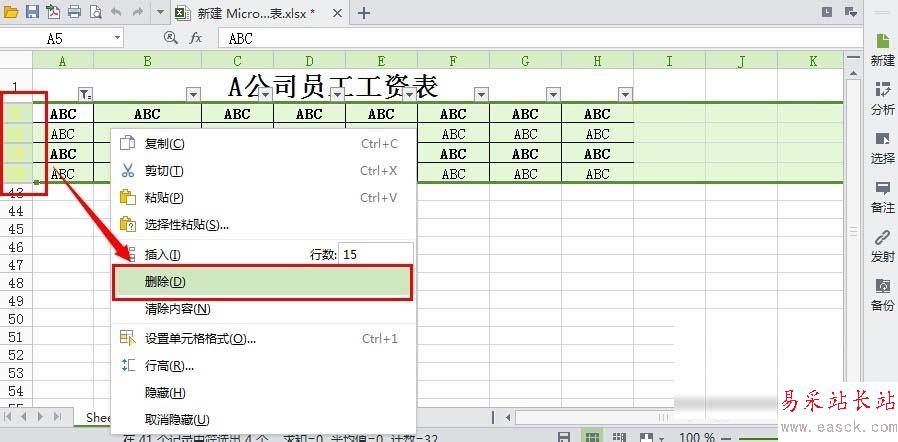 10、我們發(fā)現(xiàn)所有含有ABC內(nèi)容的行都被篩選到一起來了。選擇所有ABC行----右擊鼠標(biāo)----刪除。