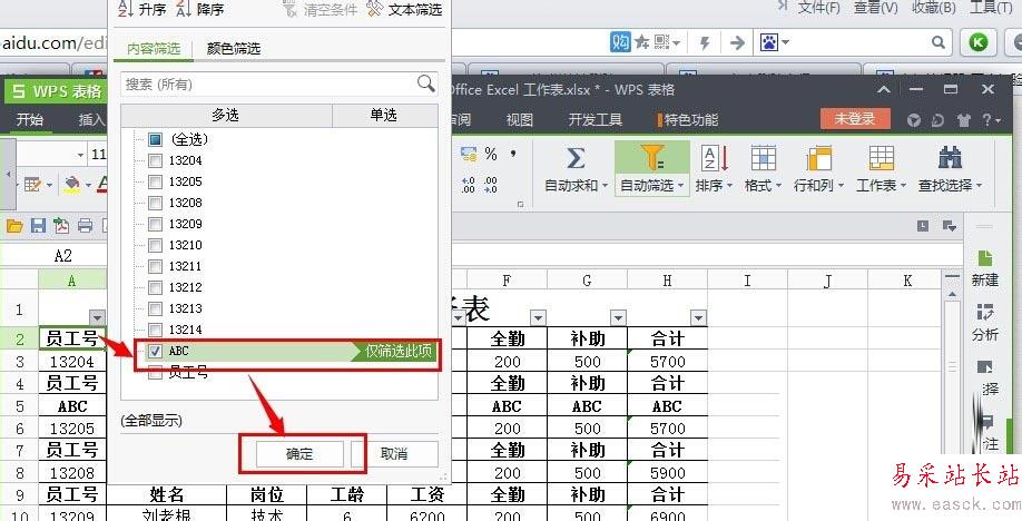 11、這時候含有ABC內(nèi)容的行就被刪除了。繼續(xù)篩選----全選----確定。