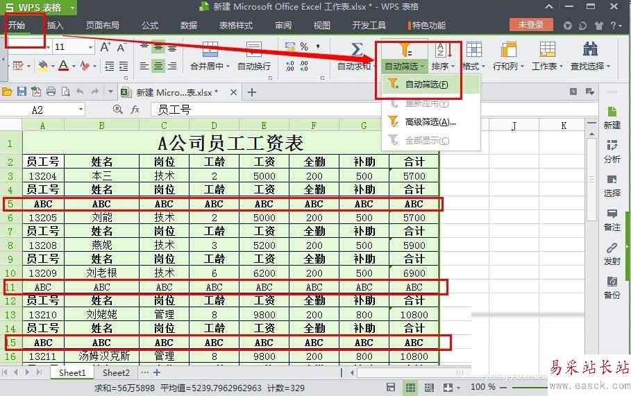 7、這時候我們發(fā)現(xiàn)原來表格的空白處單元格都已經(jīng)被替換為ABC的內(nèi)容了。我們選擇表格A-H列----開始---自動篩選。