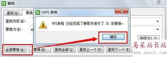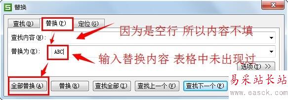 6、在替換對話框中,因?yàn)槎ㄎ坏氖强瞻仔?,所?查找內(nèi)容不需要填寫,替換為我們填寫的內(nèi)容需要原來表格中沒有的內(nèi)容以---ABC為例。填寫完成后,我們根據(jù)提示退出。