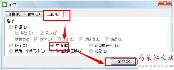 4、選擇定位----空值----定位---關(guān)閉。我們發(fā)現(xiàn)原來的數(shù)據(jù)表空白單元行都被定位出來了。