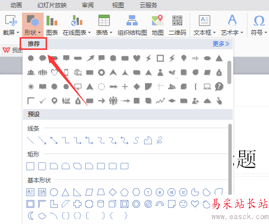 4、點擊形狀選項,在其子級菜單里找到推薦選項,如圖所示: