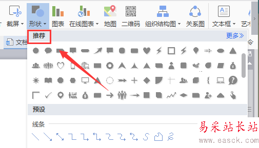 4、點擊形狀選項,在其子級菜單里找到推薦選項,如圖所示: