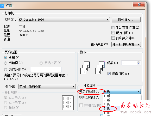 3、在“并打和縮打”選項中的“每頁的版數(shù)”里選擇6版(根據(jù)需要)