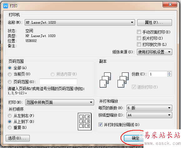 6、選擇好并打時,各頁在打印紙張上的位置。