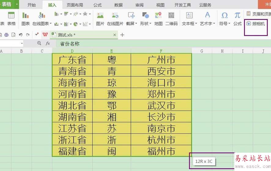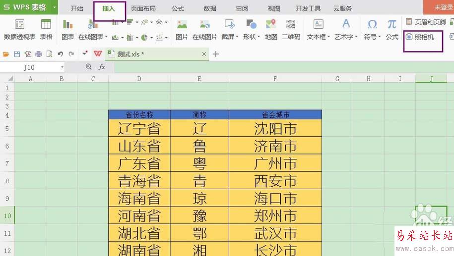 2、通過WPS小工具【照相機(jī)】,我們便可以截取出完整兼‘無損’的圖表。點擊菜單欄【插入】,工具欄右上角區(qū)域便可以看到【照相機(jī)】小工具。