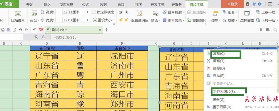 4、當(dāng)然,我們可能需要事先‘預(yù)覽’下截取效果圖,則在空白的單元格點擊下,可將剛才截取圖片粘貼出來。通過鼠標(biāo)右鍵【另存為圖片】,導(dǎo)出圖片。如對截取區(qū)域等不滿意,則再重復(fù)第4步,重新選取照相即可。