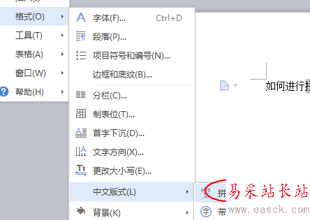 2、點擊“wps文字(倒三角)”-“格式”-“中文版式”-“拼音指南”