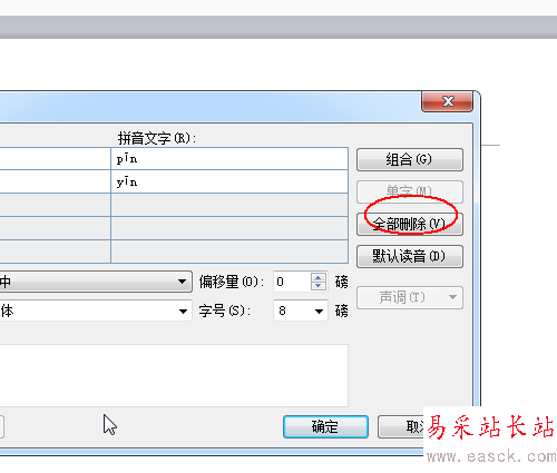 8、在“拼音指南”窗口的右側(cè)點擊“全部刪除”