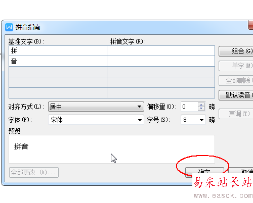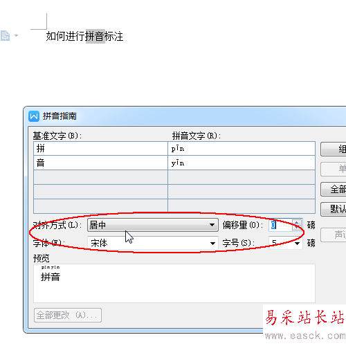 3、在拼音指南中我們可以對拼音的“對齊方式”、“字體”、“字號”和“偏移量”進行設(shè)置。如果沒有特殊要求,一般取默認(rèn)值即可。