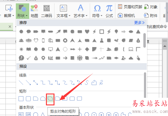 5、在矩形選項里找到對角剪去的矩形選項,如圖所示: