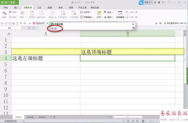 2、首先,在文檔中在“頁面布局”中打開,選擇:打印標題。在彈出的窗口中設置頂端標題行。