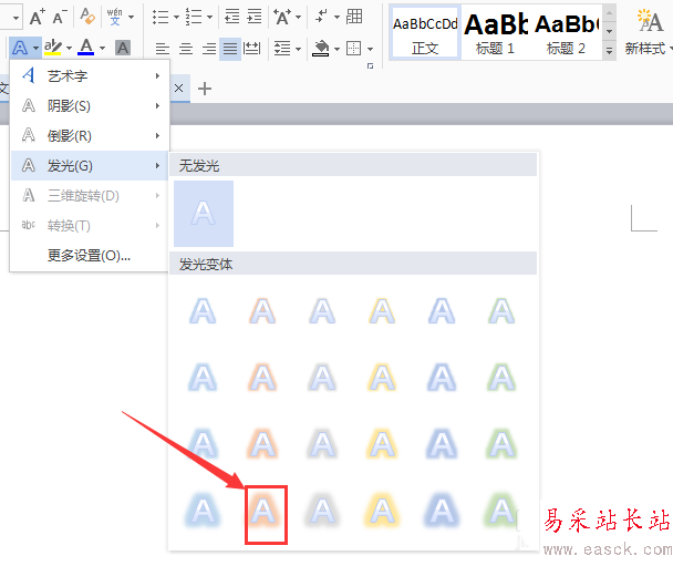 4、點擊文字效果選項,在其子級菜單里找到發光選項,如圖所示: