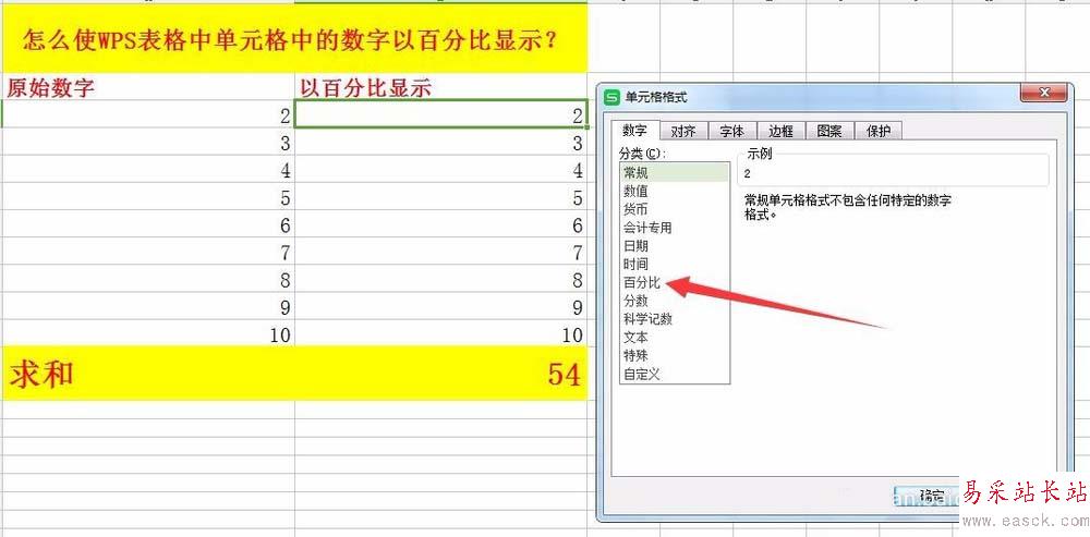 3、點擊【設置單元格式】后,彈出【單元格式】編輯框,在【數字】分類下選擇【百分比】,如圖所示。