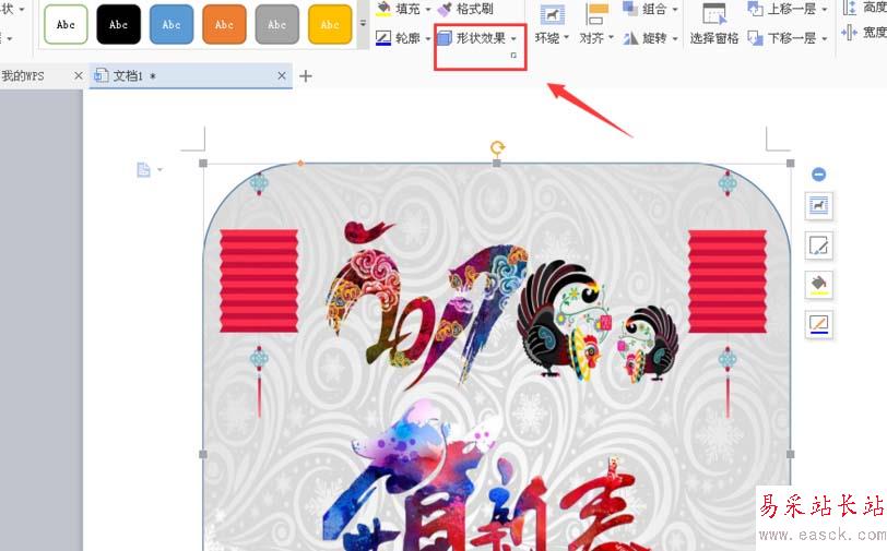 8、在該對話框內找到我們需要的新年賀卡圖片,點擊打開可以看到在剛剛繪制的圖形上就填充了該賀卡圖片,選擇該賀卡在上面找到形狀效果選項,如圖所示: