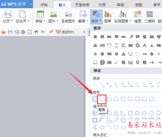 3、點擊形狀選項,在其下拉列表里找到圓角矩形選項,如圖所示: