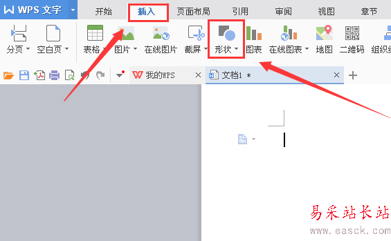 2、在該界面內找到插入選項,點擊插入進入其工具編輯區,在該區域內找到形狀選項,如圖所示: