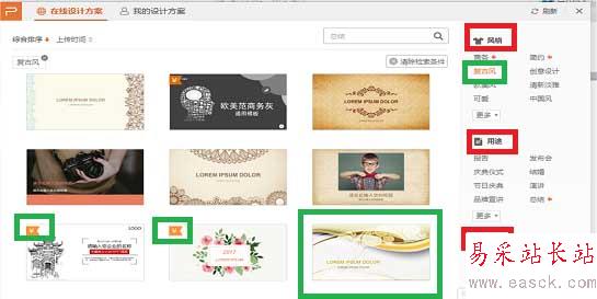 4、在在線設(shè)計方案中選擇。可以按照“風(fēng)格”,“用途”,“顏色”三種進行選擇。我在風(fēng)格中選擇了“復(fù)古風(fēng)”,最后一個模板。帶“¥‘符號的是要購買才能使用的。