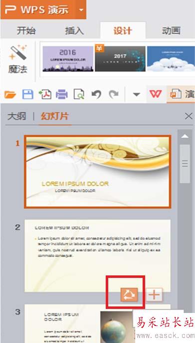 8、查看新生成的模板,不滿意可以重設(shè)。把光標放到幻燈片上,點擊箭頭符號更換新版式。