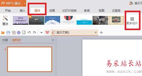 3、更換新模板。點擊上方工具欄中的“設(shè)計”,在新出現(xiàn)的設(shè)計模板中,或者“更多設(shè)計”中選擇喜歡的模板。