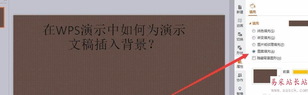 7、而且,WPS演示中,還可以選擇圖案填充方式,使用圖案作為演示文稿的背景,如圖所示