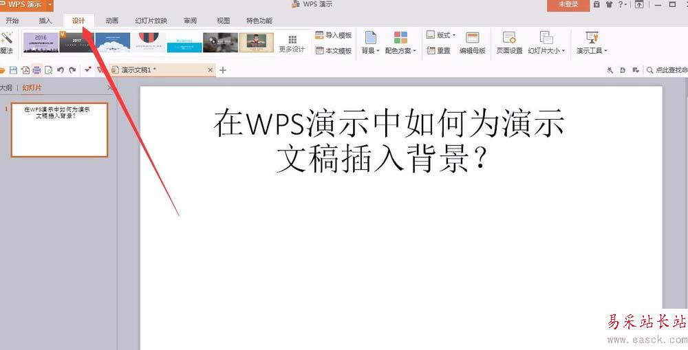 2、點擊WPS演示文稿下的【設計】,將操作窗口切換至【設計】操作窗口界面,如圖所示