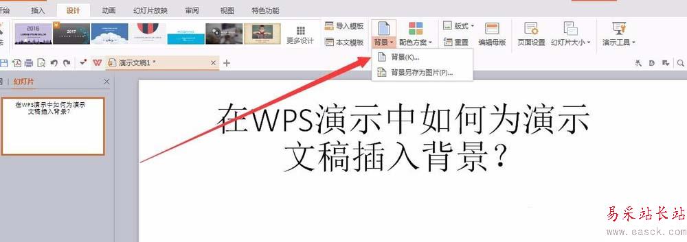3、在【設計】操作窗口,點擊【背景】,或者點擊背景下拉箭頭,在下拉內容中選擇【背景】,如圖所示
