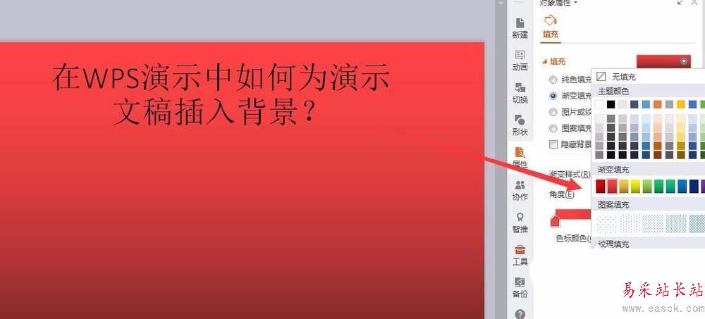 5、也可以選擇漸變顏色,在純色填充下方,也是直接選擇顏色點擊,背景隨之改變。